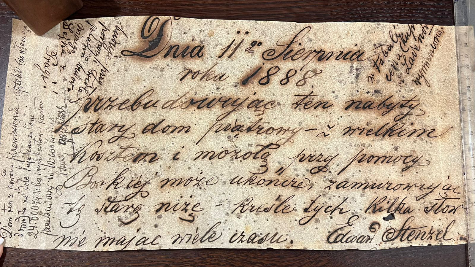 Далі — більше. Абсолютно випадково у стіні приміщення аптеки ми знайшли справжню капсулу часу. В ній було сховане рукописне послання у майбутнє від батька Стефана — Едварда Стенцеля, датоване 1888 роком.